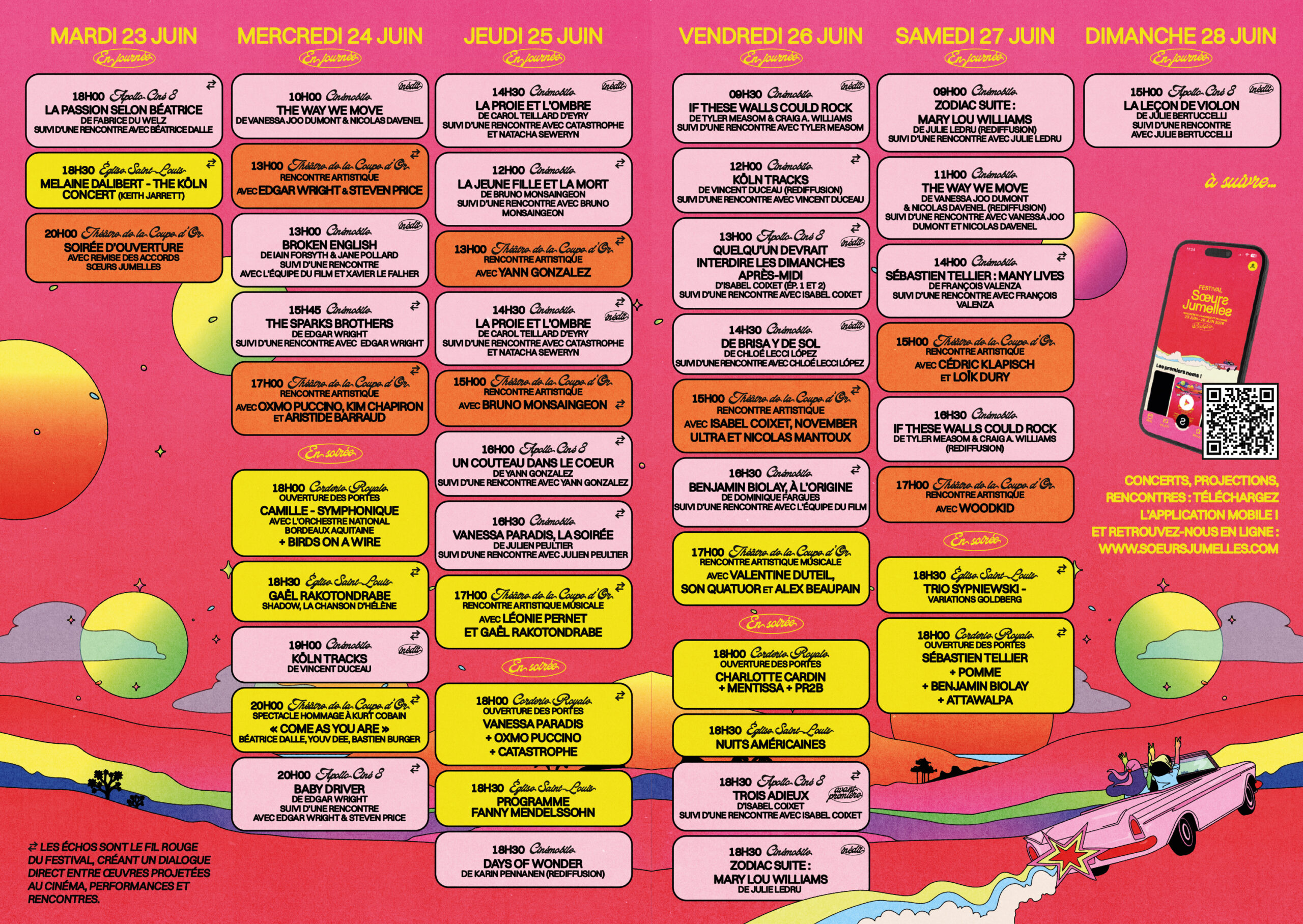 Rendez-vous à Rochefort du 23 au 28 juin pour le Festival Sœurs Jumelles 2026. Nous avons conçu un programme sur-mesure : explorez toute l’affiche ou filtrez selon vos envies entre Musique , Image et Rencontres Artistiques . Suivez le fil de nos « Échos » 🔁 pour relier documentaires et concerts lives dans une immersion totale. Réservez vos places dès maintenant et restez à l’affût : nous vous dévoilerons très prochainement nos avant-premières cinéma exclusives !